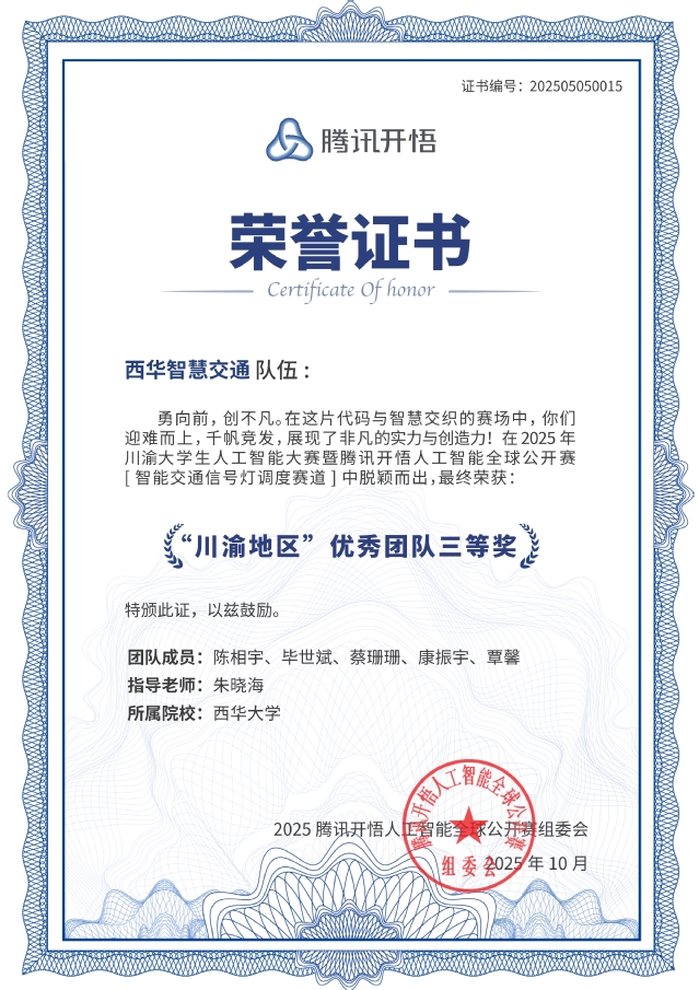 近日,2025 年川渝大学生人工智能大赛暨腾讯开悟人工智能全球公开赛智能交通信号灯调度赛道落下帷幕。西华大学汽车与交通学院陈相宇、毕世斌、蔡珊珊、康振宇、覃馨五位同学组成的团队,凭借创新的技术方案,荣获川渝地区优秀团队三等奖。