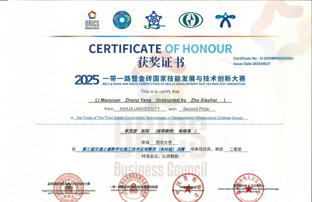 近日,教育部全国普通高校大学生竞赛榜单赛事——“一带一路” 暨金砖国家技能发展与技术创新大赛全国总决赛落下帷幕。西华大学汽车与交通学院学子在大赛交通赛项中表现亮眼,一举斩获全国一等奖、二等奖各 1 项,创下学校在该赛事中的历史最佳成绩,为校争光。